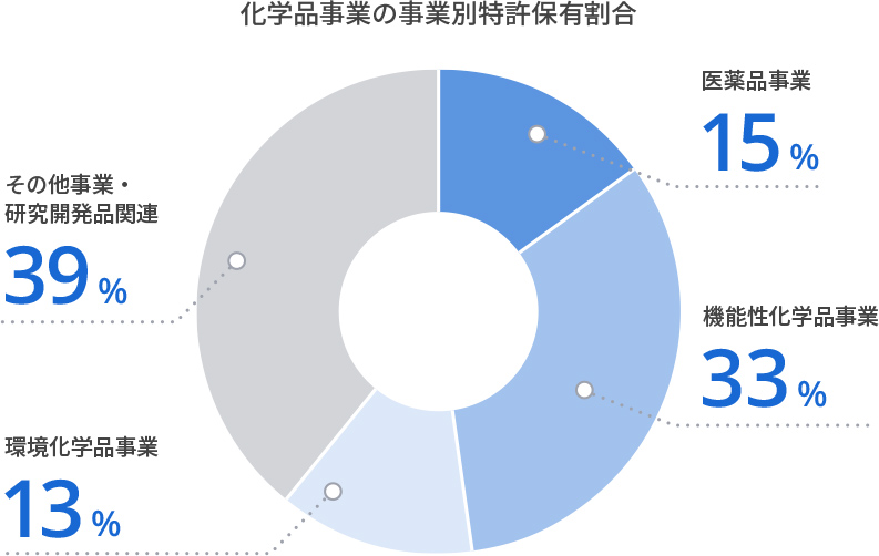 当社は、国内外で化学品事業関連の特許を1,183件保有しています。その内訳は、医薬品事業15%、機能性化学品事業33%、環境化学品事業13%、その他事業・研究開発品に関する特許が39%です(図2)。各事業の研究開発品について特許ポートフォリオを構築し、新製品開発に挑戦しています。また、既存製品については、製造方法の改良や新規用途展開等を行い、製品競争力を維持しています。