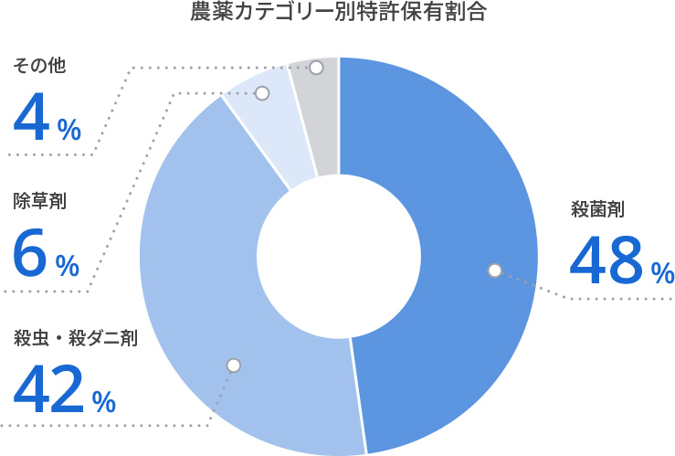 当社は、国内外で農薬関連の特許を1,477件(2022年7月時点)保有しています。その内訳は、殺菌剤関連特許48%、殺虫・殺ダニ剤関連特許42%、除草剤関連特許6%、および、その他特許4%です(図3)。これらの特許により、既存製品および開発品を保護しています。近年の研究開発の成果として、2017年に新規殺菌剤「ピシロック」、2020年に新規殺ダニ剤「ダニオーテ」、さらに2021年には新規殺菌剤「ミギワ」の国内販売を開始しました。今後は、これら新規3製品の海外展開を進めていきます。また、その他の既存製品についても、農薬混合剤の開発や適用作物の拡大を進めるなど、農薬の新たな製品価値を創出しています。現在当社は、農薬開発品について充実したパイプラインを保有しており、今後も食糧生産に貢献する農薬製品を生み出していきます。
