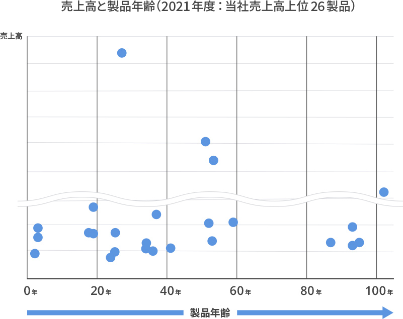 1920年の設立以来、当社は継続的に新製品を創出してきました。その結果、現在の当社製品群は、幅広い製品年齢*2で構成されています(図4)。一般的には、製品年齢が20年を超えた製品については、特許権による保護が徐々に低下*3していきます。そのため、知的財産戦略に基づき、技術ノウハウを管理し、また、技術を多面的にとらえて、改良技術に関する新たな特許権を生み出す等の施策を実施しています。その他、ロングセラー製品の競争力を維持するために、ブランド力を強化しています。また、技術ノウハウを承継するための人材育成をおこなっています。今後も新製品とロングセラー製品から、安定したキャッシュの創出を見込んでいます。