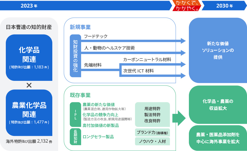 既存分野への知的財産投資に加えて、今後は、新たな研究技術戦略において設定した3つの研究ドメイン「食料(フードテック)」、「医療(人・動物のヘルスケア)」、「先端材料(次世代ICT材料・カーボンニュートラル)」について、知的財産投資を強化していきます。当社は、これら3つの研究ドメインの中から、新規事業創出を目指しています。新規事業の戦略を考える際には、市場情報や知的財産情報など様々な情報を総合的に検討する必要があります。当社知的財産部門にはIPランドスケープを担当するチームを設置しており、知的財産情報の分析等を通じて新規事業創出活動を支援しています。